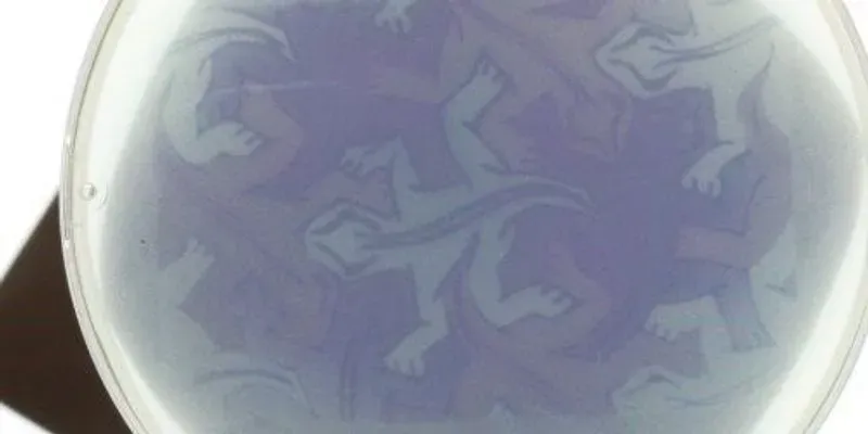 La bacteria como píxel (La fotografía visible): El laboratorio de Chris Voigt en el MIT logró algo que parecía ciencia ficción: crear bacterias con «visión en color». Al principio, la fotografía bacteriana era simple (sombras en blanco y negro), pero Voigt utilizó ingeniería genética avanzada —donde herramientas tipo CRISPR ayudan a ensamblar circuitos complejos— para programar a la bacteria E. coli. ¿El resultado? Bacterias que producen pigmentos rojos, verdes o azules (RGB) según la luz que reciben. La placa de Petri se convierte así en un papel fotográfico vivo: proyectas una imagen sobre el cultivo y, tras unas horas de incubación, las bacterias «revelan» la foto produciendo color biológico. No es tinta; es vida reaccionando a la luz.